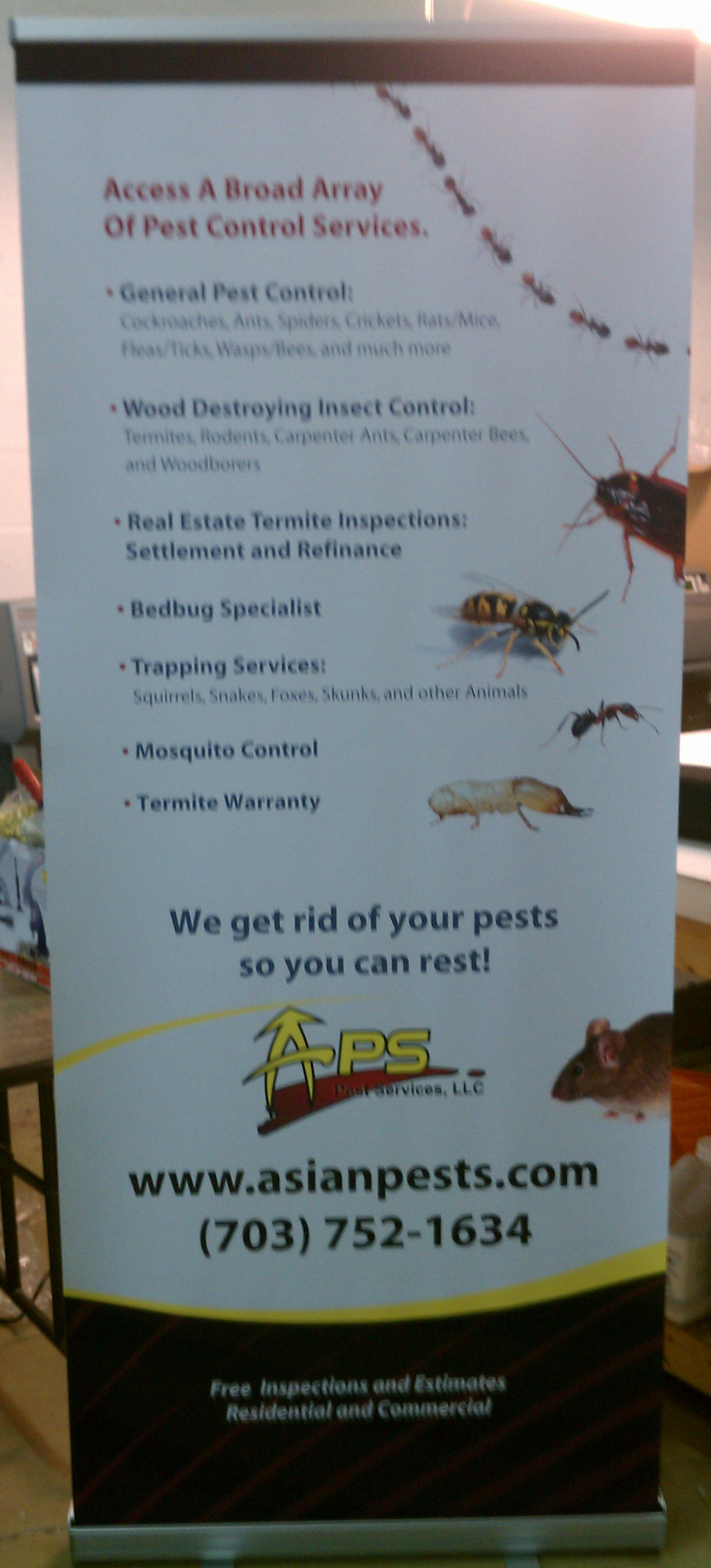 My Role: Design retractable banner using Illustrator using design from customer's brochure that was previously printed. Used Photoshop to make the background of the insects and logo transparent. As I was in charge of the wide format HP5500PS, I loaded the vinyl material, printed the banner, cut the banner to size and installed in the retractable banner hardware.